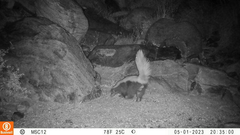 This project is just beginning, but we already have made some fascinating discoveries. For the first time ever, the Conservancy documented an American hog-nosed skunk (Conepatus leuconotus)! That brings the total number of mammals recorded in the Preserve to 41. In fall 2023, we conducted a survey at 30 locations, documenting 19 unique species (16 mammals, 2 birds, and 1 reptile) and identified a few sites with higher diversity that were either near a water source or farther away from urban development. In 2024, we conducted our first spring and fall surveys at all 60 sites!
